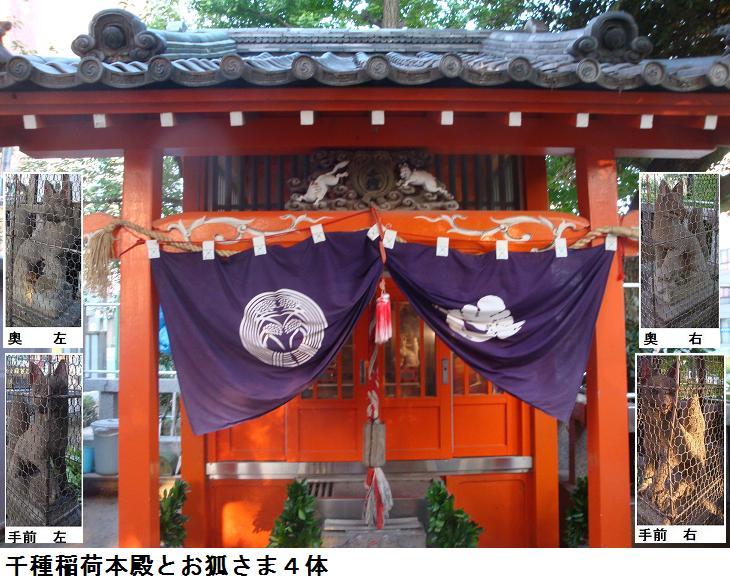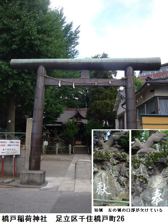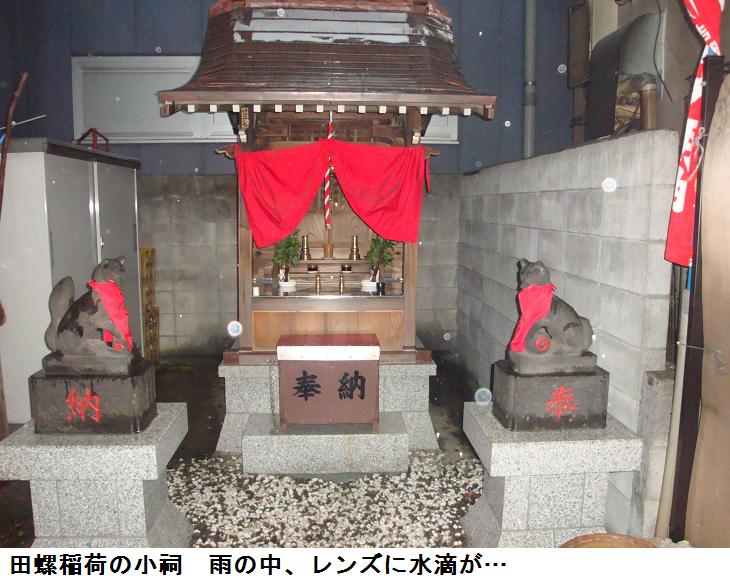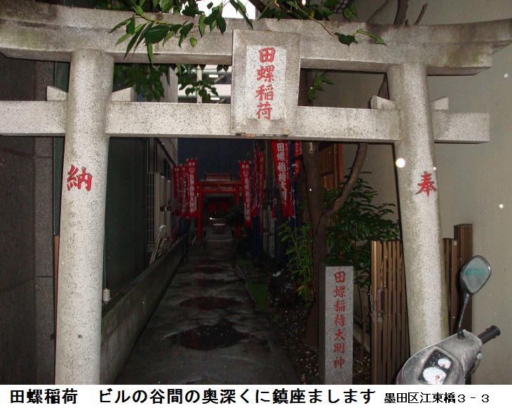 四之橋北詰に来ると、昨日は馬車通りとダービー通りを行ったり来たりしたのであるが、今日は竪川沿いの道から歩いてみた。この辺りには妖しげなキャバクラ紛いの店舗や連れ込み宿がならんでいて、朝も早いというのに、店の中からはバンドの演奏と男女の嬌声が響いてくる。あったあった在りました。道に面して鳥居がありその前をバイクが塞いでいる。鳥居を潜ると、ビルの谷間の奥まった所に田螺稲荷の小祠があり、前をお狐様が見護っている。辺りを見回してみたが、何処にも説明板らしきものは見当たらない。かなりの雨が降ってはいたが、構わずに取り敢えずデジカメに収めておくことにした。