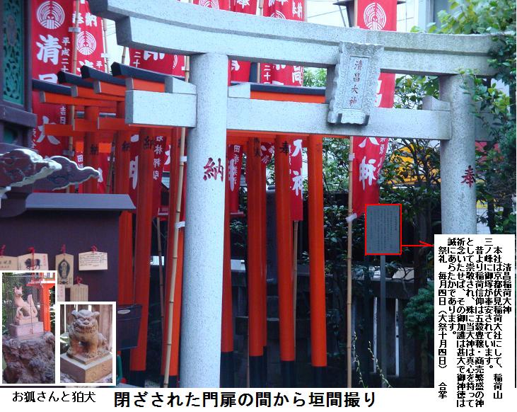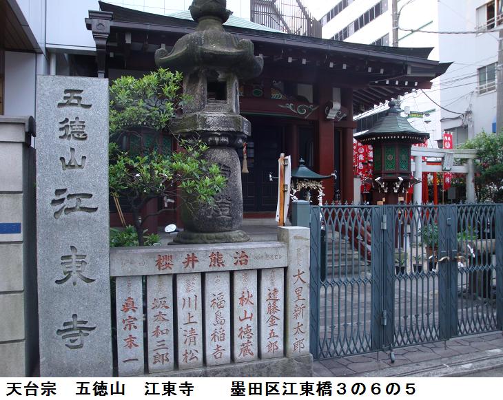 四つ目通りを南下して四之橋の北詰まで来たが、路地をあちこちと訪ねているうちに、天台宗の江東寺というのがあった。山号は五徳山と号し、通称江東観音と呼ばれるという。本尊は千手観世音菩薩を祭り、昭和15(1940)年坂東三十三観世音十六番札所水澤観世音(群馬県伊香保市)の別院として建立されたという。錦糸町駅から近いこともあって、錦糸町の観音様として親しまれているという。狭い境内の中に清昌稲荷というのがあるが、江東寺の門扉は閉ざされていて境内には入れない。門扉の鉄柵の間にカメラを突っ込んで何とか写真を収めた。