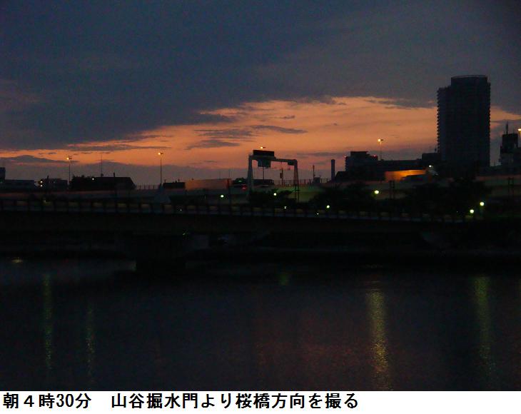 まだ、薄暗い隅田公園の山谷堀水門の前に来ていた。桜橋越しに日の出前の朝焼けが綺麗だ。いつの間にか昨日と同じ桜橋通りを歩いていた。東武伊勢崎線の踏み切り近くになって、驟雨がやって来た。先ほどの桜橋の朝焼けはどうしたのだろう? 引き返そうかとも思ったが、家に帰った途端に「止んだ」では口惜しいので、夏場だし張子の虎じゃあるまいし、濡れたってどうということはないので、そのまま四つ目通りを南下する。蔵前橋通りにかかるころに雨は一旦小降りになったが、錦糸町駅東にある京葉道路に横切る歩道橋を渡っているとまた降り出した。ずぶ濡れになりながら、万歩計とカメラが濡れてはとちょっと気になる。