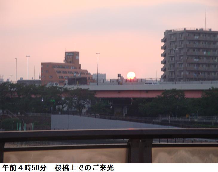 今朝は、気がつくと桜橋の上にいた。今しもご来光、時計を見ると4時50分。いつしか、押上商店街を抜けて四つ目通りを歩いている。昨日は別にして、ここ4・5日は、四つ目通りを南下し、三つ目通りを北上して帰宅というパターンを繰り返しているようだ。