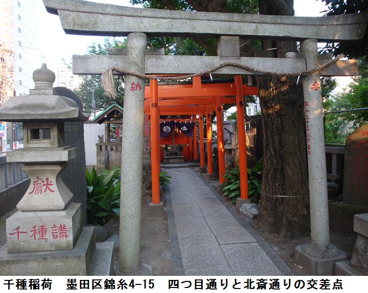 四つ目通りが北斎通りと交差する、錦糸公園の南西の端っこに千種稲荷があった。千種稲荷は徳川四代将軍家綱の時(寛文~延宝)に治水工事が行われその後、柳島村の守護神として祭られたと伝えられているそうだ。明治時代になっても、この稲荷神社は保護されて郷土の守護神として残されたという。その後陸軍糧秣廠(りょうまつしょう、陸軍の将兵の食糧や軍馬の秣を蓄えた役所)本所倉庫をこの地に建設した際、敷地内にあった稲荷神社を取り払ったところ再三火災が発生したそうな。そこでもとの位置に稲荷社を再建して祀ったところ不思議にもその後火災はまったく起こらなかったという。大正12(1923)年の関東大震災はもちろん、昭和20(1945)年の東京大空襲にもなんの被害もなく多くの人が境内に避難し戦火を逃れたという。現在は錦糸公園の南西の端、北斎通りに面したところに祀られている。