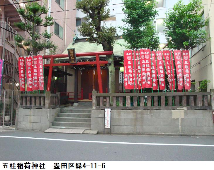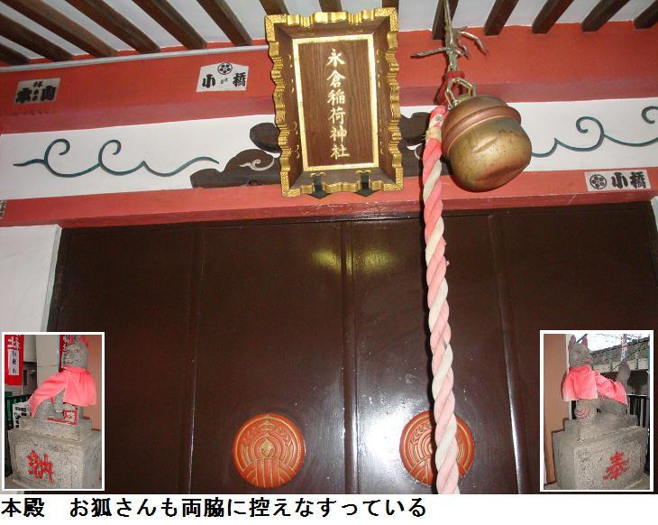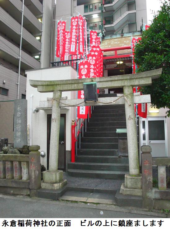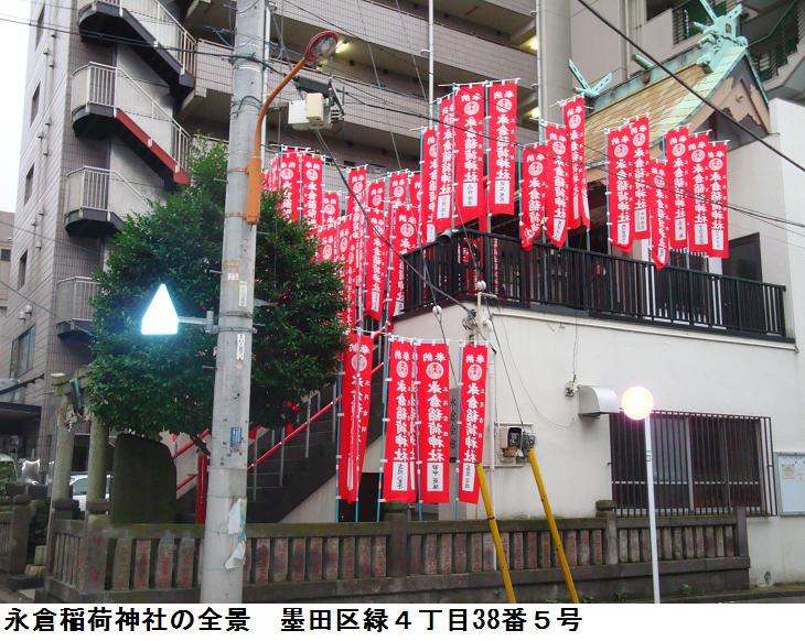 竪川中学校の前をさらに南下して総武高架線を潜るとすぐに永倉稲荷神社がある。永倉稲荷神社は大正2(1913)年に本所区永倉町(現在の墨田区亀沢辺り)にあった菓子商宅から出火し、永倉町始まって以来の大火災となったが、鎮火後焼け跡から稲荷の社跡が発見され、占ったところ、この火災は稲荷大神の災とご宣託があったので有志で社を建立し、火厄よけの神として、奉斎したことから始まったという。その後昭和20(1945)年に、戦災で社殿を消失したため、現在の墨田区緑四丁目に新しい社殿・社務所を建立したということである。敷地は約17坪(約56㎡)、氏子155世帯と非常に小さな神社だが、火厄よけの神として、地域を守っているという。