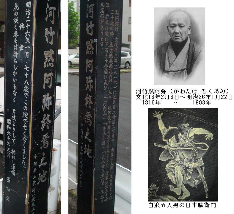 永倉稲荷神社から総武線にそって三つ目通りに出る。一昨日と同じ道を通るのも能がないので、北斎通りを西進し、区役所通りを北上することにした。北斎通りから区役所通りに入ってすぐのところに「河竹黙阿弥終焉の地」の案内柱が立っている。木阿弥は幕末から明治に掛けて活躍した狂言作者で、主人公は泥棒が多く、自らを「白浪作者」と称したほど、登場人物は大抵悪人なのである。黙阿弥作品では、その「悪」までが絵画的に美化されるのである。