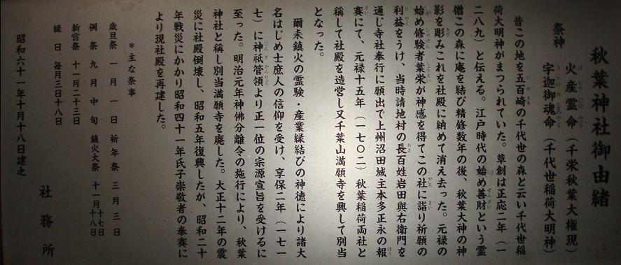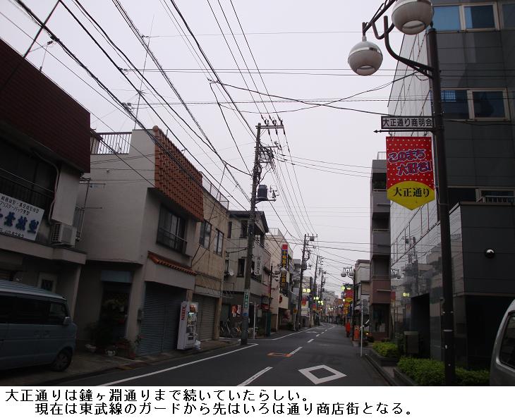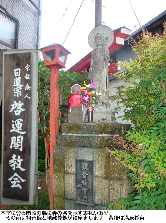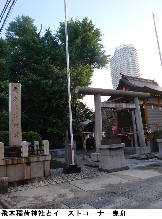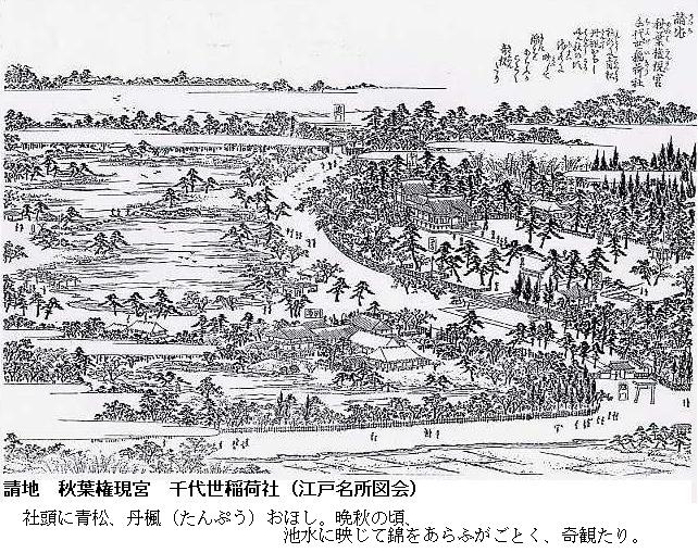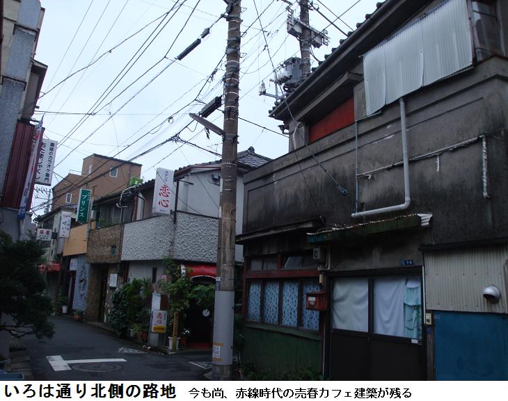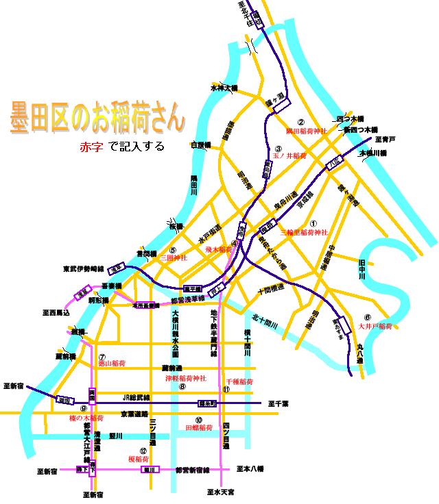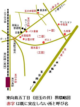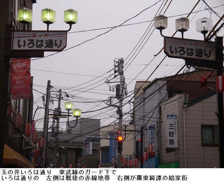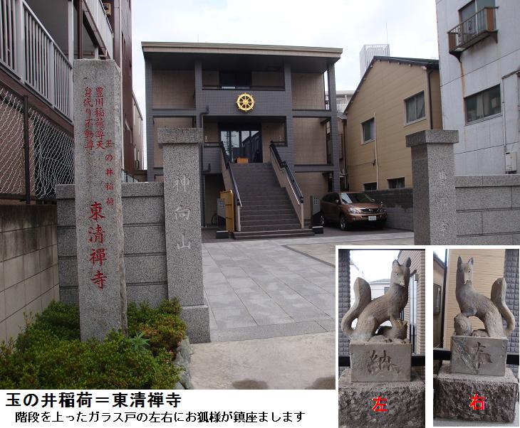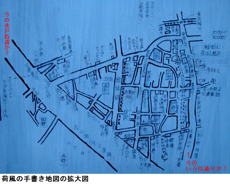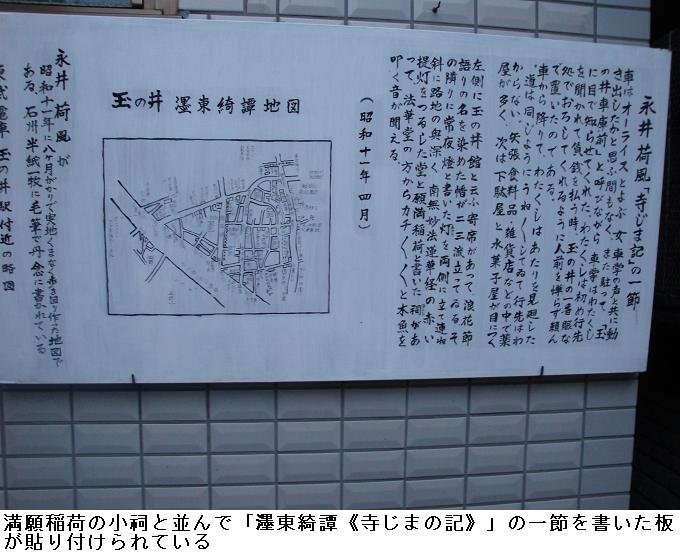 《……車はオーライスとよぶ女車掌の声と共に、……法華堂の方からカチカチカチと木魚を叩く音が聞こえる。……これと向かいになった車庫を見ると、さして広くもない構内のはずれに、燈影の見えない二階家が立ちつづいて、その下六尺ばかり、通路になった処に、「ぬけられます。」と横に書いた灯りが出してある。……辻の向側には曹洞宗東清寺と刻した石碑と、玉の井稲荷の鳥居と公衆電話とが立っている。わたくしはお雪の話からこの稲荷の縁日は月の二日と二十日の両日である事や、縁日の晩は外ばかり賑やかで、路地の中はかえって客足が少ないことから、窓の女達は貧乏稲荷と呼んでいる事などを思い出し、……》