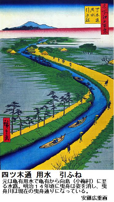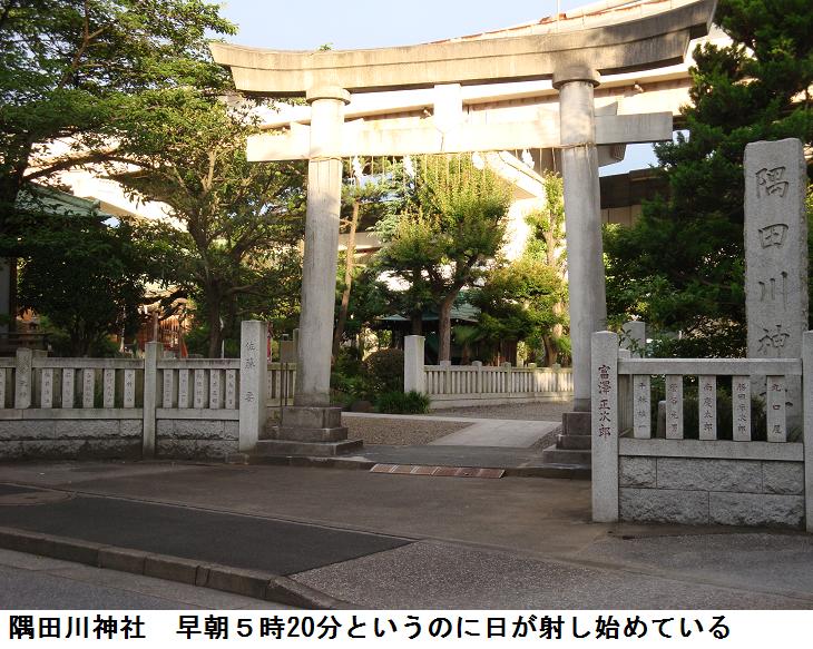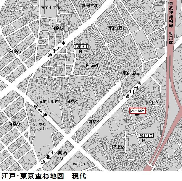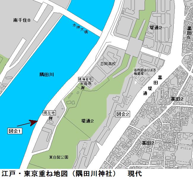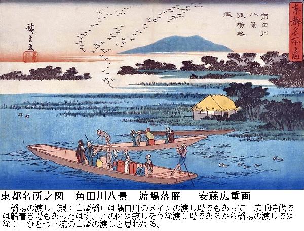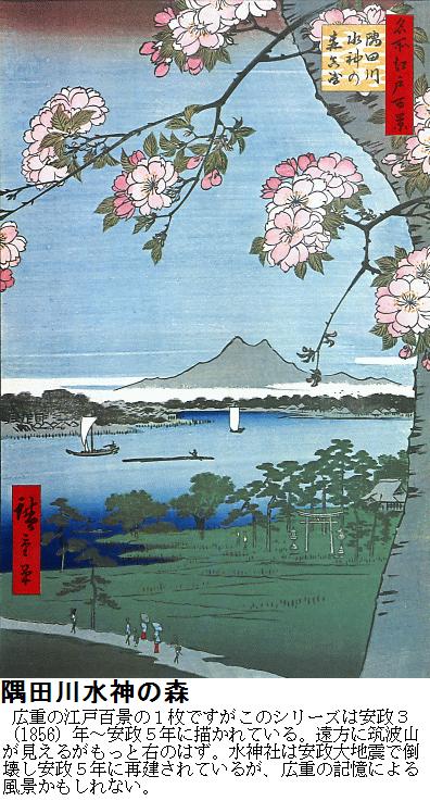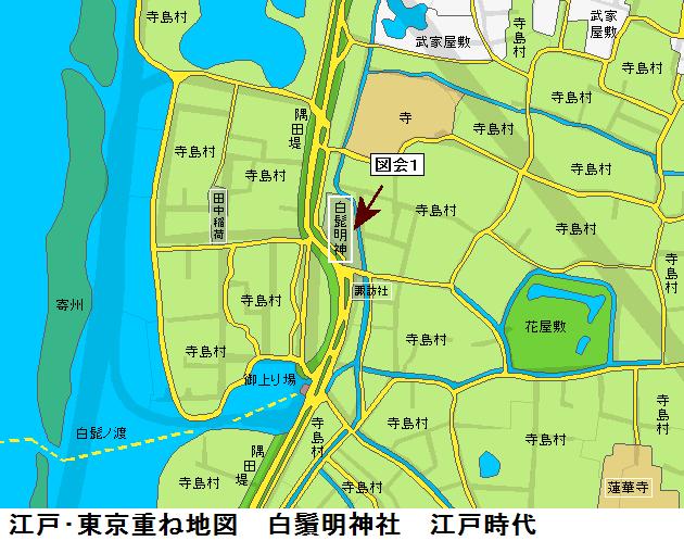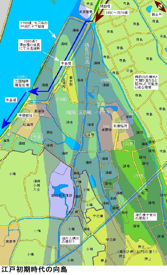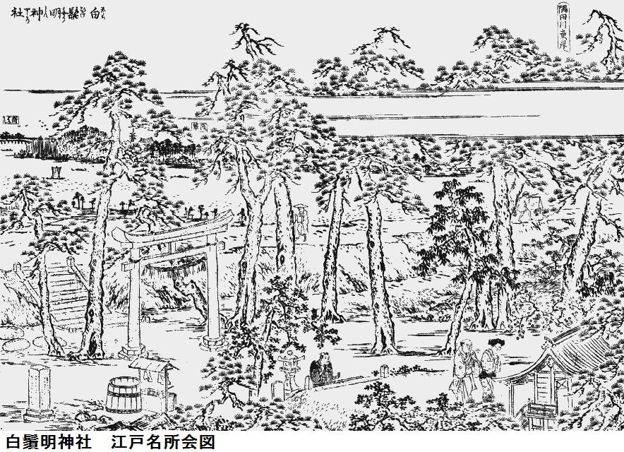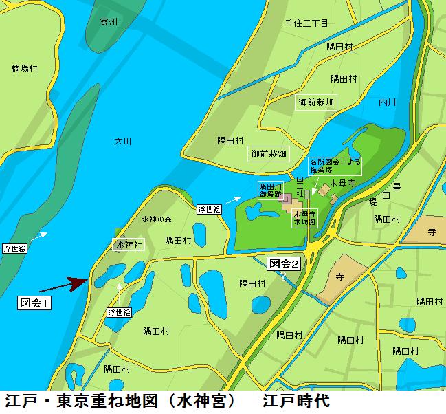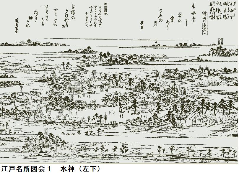 隅田川神社は水神宮の前は「浮島の宮」とも呼ばれていたようで、入間川と古隅田川の水流がぶつかりあう関係で中洲が生じていたのであろう。中洲が東岸とつながってゆくのは利根川東遷によって古隅田川の水量が減り、ついには廃河となる1700年頃と思われる。江戸時代での奥州路は千住大橋経由となっていて、当地は江戸庶民の観光地となっていたために水神という古典的な形を残したのかもしれない。
