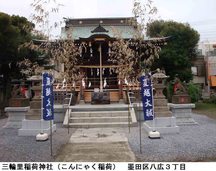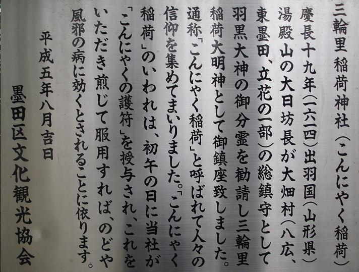 三輪里稲荷神社はこんにゃく稲荷と言われている。それは初午の日に「こんにゃくの御符」を授与するかららしい。江戸時代、このあたりは大畑村という農村地帯だったが、流感がはやったとき、この神社でこんにゃくを竹串に刺してゆでた汁を村人に飲ませ、それで風邪が治ったところから、初午の日にこんにゃくの御符を授与するようになったと伝えられている。稲荷神社だから祭神は倉稲魂命(うかのみたまのみこと)である。鳥居の傍に簡単な由緒を書いた立て札がある。