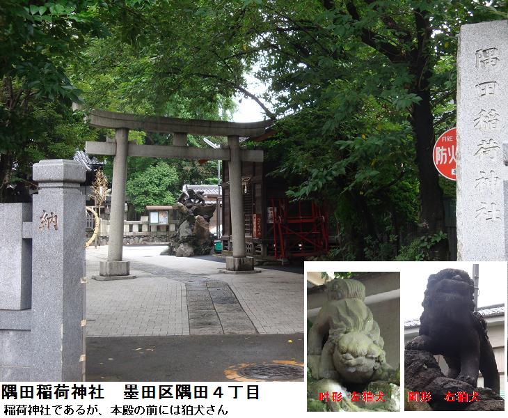 隅田川稲荷神社は稲荷だから、祭神は宇迦之御魂命(うかのみたまのみこと)ということになる。ここの境内にはお稲荷さんというのにお狐様がいない。本殿前には狛犬さんが鎮座まします。社伝によれば、天文年間(1532~54年)伊豆の堀越公方・足利政知(将軍足利義政の弟、伊豆の堀越《今の韮山町》に居を構えたため、堀越公方とよばれた)の家臣であった江川善左衛門雅門は、主家滅亡後、一族郎党とともに当地に逃れ、土地を開墾して善左衛門村を開いた。善左衛門は信仰心篤く、伏見稲荷より御分霊を勧請し、村の鎮守としたという。その後、五代目善左衛門が伊勢神宮に参拝した折、悪鬼に襲われたが、8人の山伏が現れ、危難を救ってくれた。この山伏たちは善左衛門を村まで送ると、忽然と消えてしまったという。戦前までは、この霊験に因んで八僧稲荷、あるいは善左衛門の徳をたたえて善左衛門稲荷と称したという。大正2(1913)年荒川の改修工事のため、現在地に遷座。昭和7(1932)年村社に昇格した。現在の社殿は昭和18(1943)年の改築であるという。