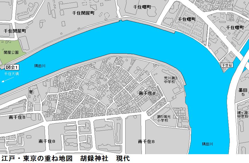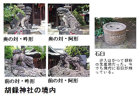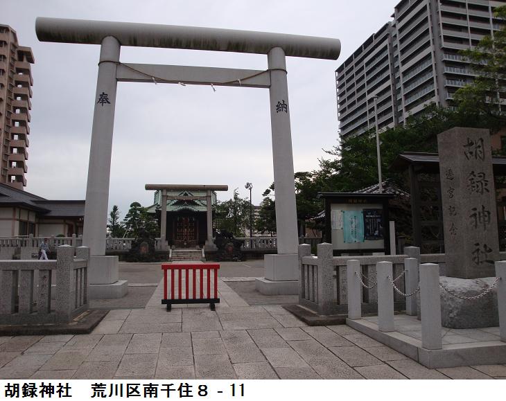汐入は胡粉(貝殻を粉にした顔料)の産地であり社内にその石臼が残っている。胡禄の呼称は胡粉と第六天からという説と弓の武具の呼称からという説があるが、類名社は千葉、埼玉、東京に分布しているのでなんらかの氏族が関与しているのかもしれない。胡粉の材料には縄文貝塚のカキ殻を用いていたらしい。「江戸紀聞」によれは道灌山(現:文京区千駄木3付近)は雪の降ったような小山で享保(1716~1735年)の頃までは馬で浅草の胡粉製造場所へ毎日運んでいたという。汐入も昔は海が入っていたところの地名であるから、貝塚があったのかもしれない。摂社に道祖神があり猿田彦を祀っている。足の病気治癒に草履、耳の病気治癒に2個のお椀に穴をあけて奉納して祈願していたという。周囲はマンション群の造成に囲まれてはいるが、社地にはいくらかの木立が残っているようである。