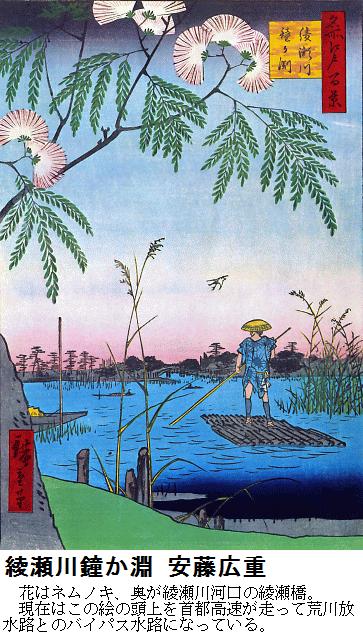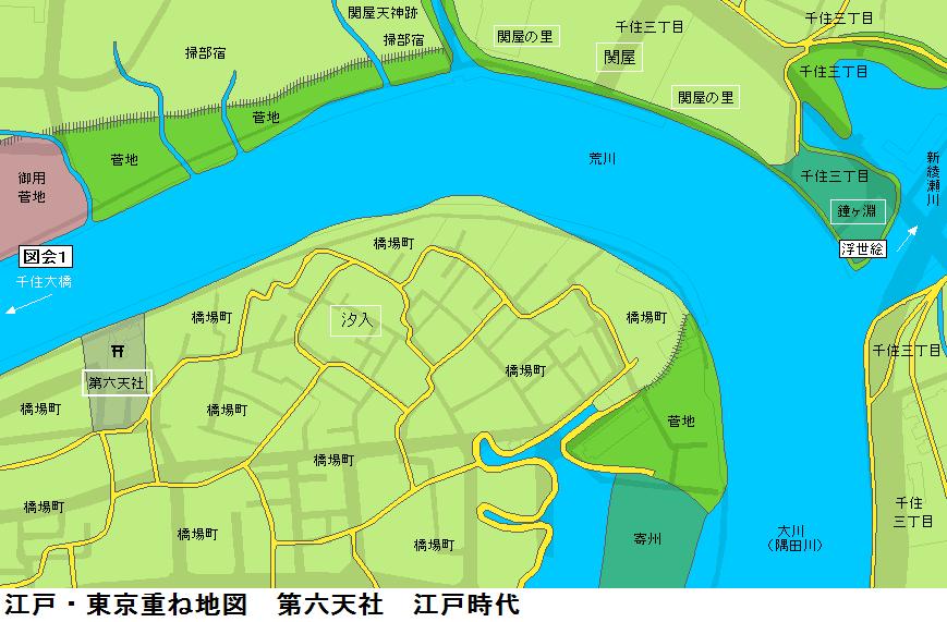 1487年の尭恵法師(1430~1498年)の北国紀行に「利根、入間の二河落ちあえる所に、かの古き渡りあり、東のなぎさに幽村あり、西のなぎさに孤村あり」とある。各地で戦国大名が旗揚げし、関東では北条早雲が伊豆を奪う頃である。西の孤村が石浜、東の幽村が関屋(旧関屋、新荒河橋付近)だろうか。