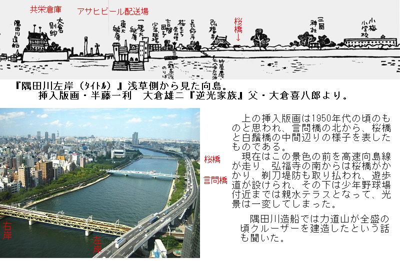 墨堤通りに入り、アサヒビール配送場を過ぎた所に、なんでも本社は大阪だという共栄倉庫株式会社の東京支社がある。そのビルの前に「大倉喜八郎別邸」という説明板がある。彫り字に流した黒ペンキが剥げて読みづらいが、曰く、『この一角は、田沼意次にとり入り、養女を大奥にいれて権勢をほしいままにした。中野碩翁の別邸跡で隅田川に面してを贅こらしていた。そこを明治の政商、大倉喜八郎が受け継ぎ、大蔵別邸としていた。邸内の川に面して建てられていた「蔵春閣」は船橋の「ららぽーと」に移築されている。(共栄倉庫株式会社)』