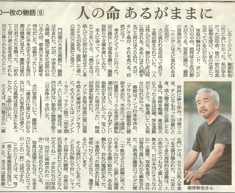 6月18日(木)の夕刊に門司出身の写真家の記事が掲載されたので、これをスキャンし、門司の関係者にメールして問い合わせた。曰く、「2枚の貼付文書は6月18日(木)の朝日新聞の夕刊に載ったものです。藤原新也という写真家は、昭和19年門司港の藤之屋という旅館の2男坊だそうです。15歳まで、門司にいたといいますが、昭和33(1958)年関門国道トンネルの開通に伴う地画整備のため旅館が撤去になり、別府に移ったといいます。どなたか「藤之屋」という旅館が門司港のどこにあったのか、また藤原新也という写真家の出身小学校をご存知の方がいらっしゃいましたらお教え下さい。宜しくお願いします。」