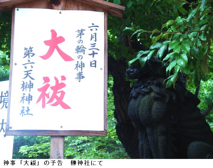 榊神社の狛犬の横に「大祓(おおはらえ)」の予告貼札が出ている。大祓(おおはらえ)とは、6月と12月の晦日(みそか、新暦では6月30日と12月31日)に行われる除災行事で、犯した罪や穢れを除き去るための「祓え」の行事と信じられ、6月の大祓を夏越の祓(なごしのはらえ)、12月の大祓を年越の祓(としこしのはらえ)といわれている。701年、大宝律令によって正式な宮中の年中行事に定められ、この日には、朱雀門前の広場に親王、大臣(おおおみ)ほか京(みやこ)にいる官僚が集って大祓詞(おおはらえのことば)を読み上げ、国民の罪や穢れを祓った。衣服を毎日洗濯する習慣や水などのない時代、半年に一度、雑菌の繁殖し易い夏を前に新しい物に替える事で疫病を予防する意味があった。その後、百年ほどは盛大に行われたが、次第に衰え応仁の乱の頃から行われなくなったという。江戸時代(1691年)に再開され、次第に広まったらしい。1871年の太政官布告にて明治新政府により「夏越神事」「六月祓」の称の禁止と「大宝律令」の「大祓」の旧儀の再興が命じられ、全国の神社で行われるようになった。戦後には「夏越神事」「六月祓」の称も一部では復活し、現在に至っているという。