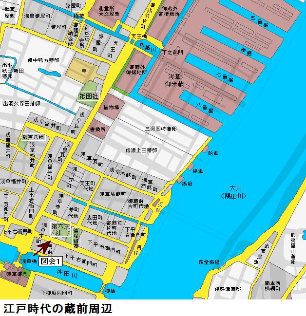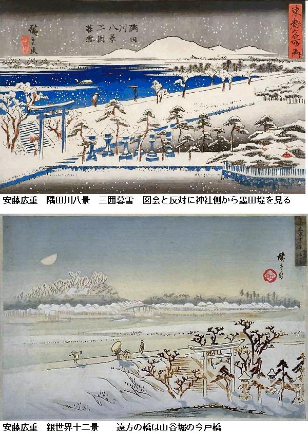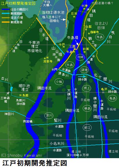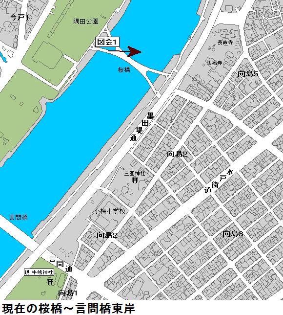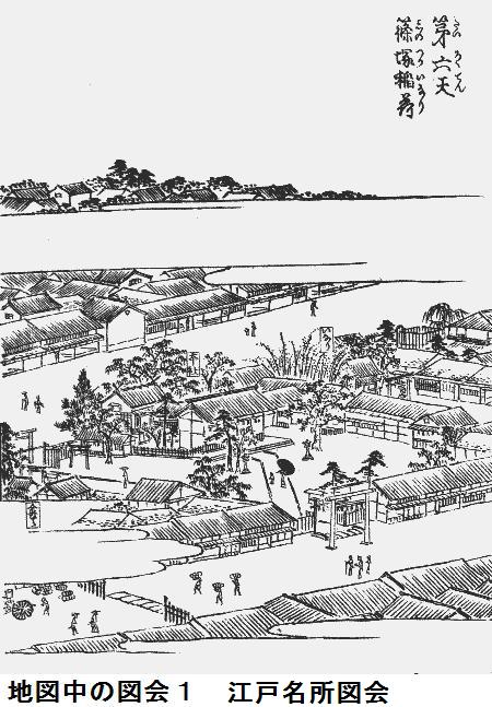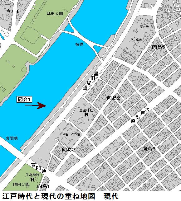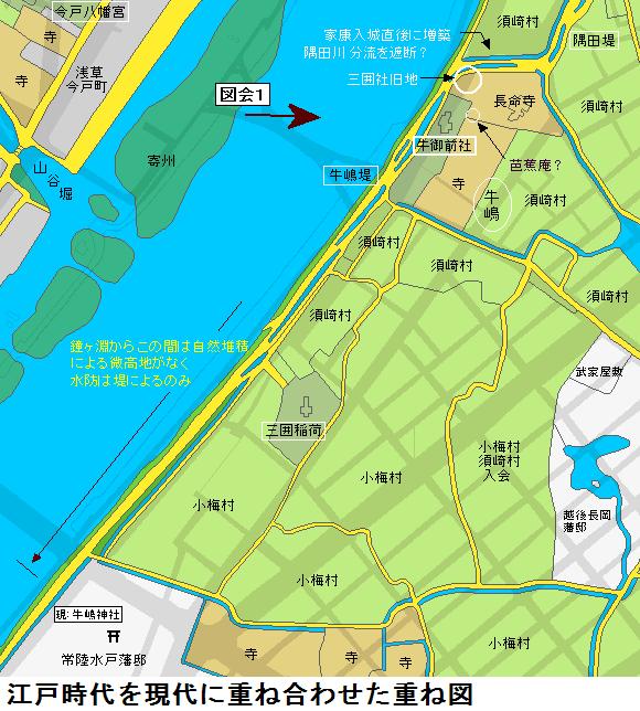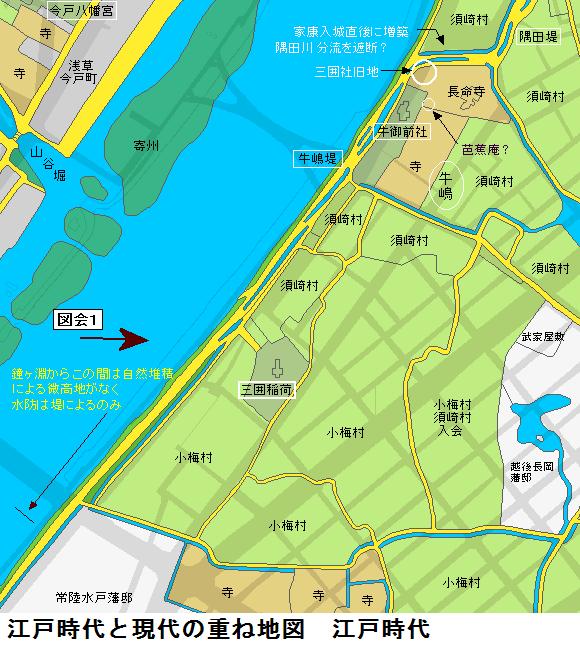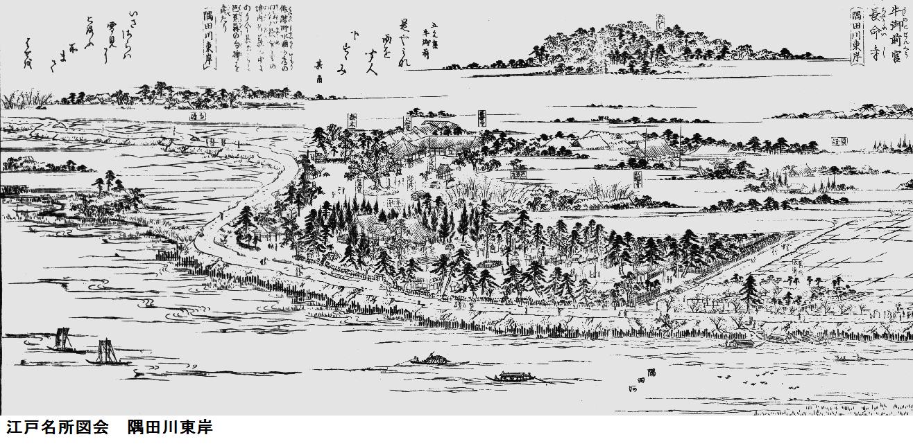 図会の左手の堤が折れ曲がっているが、風土記稿には折れ曲がった向こう辺りまでが古来からの隅田堤であり、折れ曲がったあたりから手前が牛島堤であるとあります。家康入城直後(1590年頃)に牛島堤が築堤されて隅田川の分流部を遮断した可能性があるという。