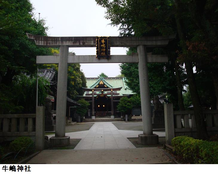 牛嶋神社は、貞観2(860)年に御神託によって須佐之男命を祀り、後に天穂日命(下註参照)を祀り、ついで清和天皇の貞辰親王(第7子)を祀って王子権現と称す。本所区向島須崎町に鎮座していたが、昭和初期に現在地(水戸藩邸跡地)に移転。