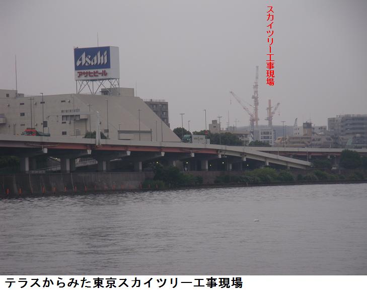 桜橋に近付いた所で東京スカイツリーの工事現場を撮ろうとカメラを構えていると、桜橋を潜り川を上る引き船が上ってきた。この辺りは1960年代に対岸で高速道路の工事が始まり、70年代からは向島線が開通、それに合わせるように山谷堀の埋め立てが行われ、今の水門が設けられた。続いて、80年代には桜橋が掛けられ、川ッぷちはテラストしてせいびされ、景色を一変させてしまった。そして、今またこの向こうに高い東京スカイツリーが立つという。