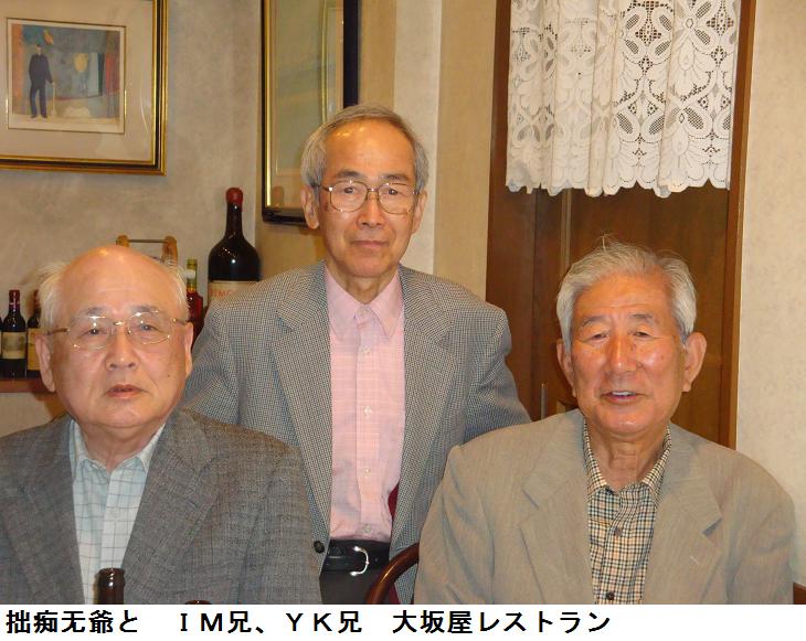 そこへ、YK兄とIN兄が来訪。しばらく、先客は婆様に任せて、爺は旧友と仕事場で昔話等をして、11時45分頃、3人で予約してあったレストラン大坂屋に出掛ける。ここの兄妹は2人して、かつての兼愛塾に通った、塾友である。妹のSちゃんが事前に連絡してくれたのかAちゃんを呼んでくれた。Sちゃんの母上までお店に出て来て挨拶してくださり、恐縮した。兄上のH氏ともお会いしたが、厨房で忙しそうだったので、写真に撮ることはできなかつた。2時間ぐらい大阪屋で話が弾み、大坂屋を出たのは2時過ぎになっていた。