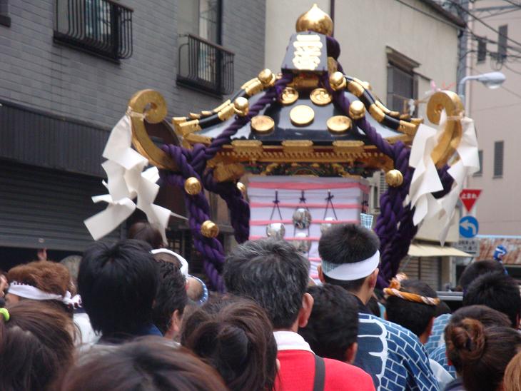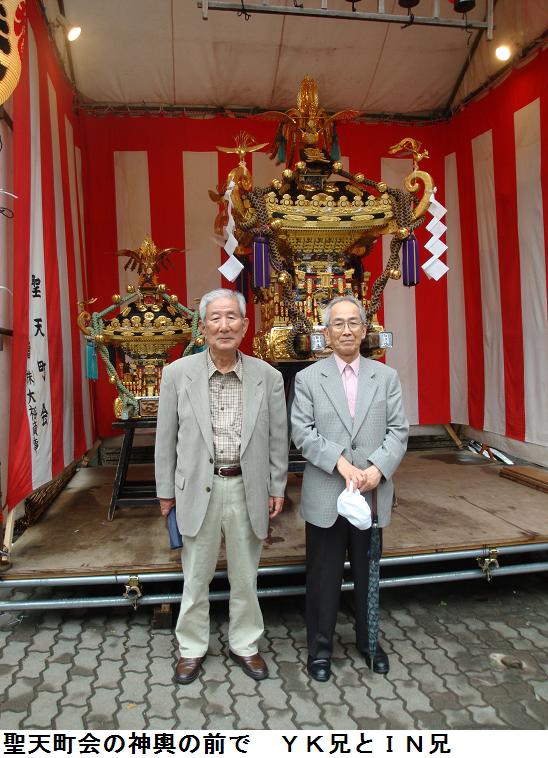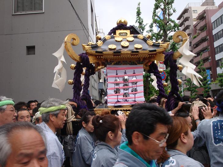 一旦家に帰り、しばらく話し込んでいたが、4時頃になりあまり夜遅くなってもと、江戸通りまで送って出た。彼らと別れると、小松通りの方から近付いてくる神輿(二の宮)が見えたので、写真に収めてみた。神輿を写真に撮るのは難しいものである。とくに担ぎ手をカメラに入れるのは難しい。