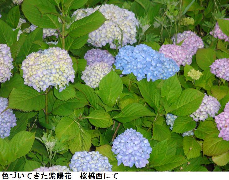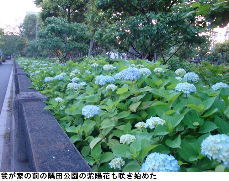墨田公園は紫陽花が一斉に色づき始めたようだ。紫陽花にもさまざまな品種があるようである。台東区では2・3年前から「アジサイロード」と銘打って、紫陽花の植樹を進めているらしい。1株2000円の寄付をしたものの氏名とメッセージを記した銘板が3・4か所に設けられている。株主は台東区内外の人々で、すでにかなりの数に達しているらしい。