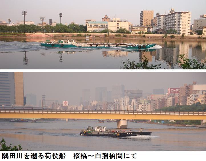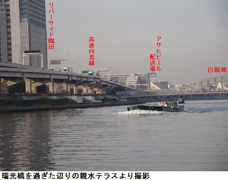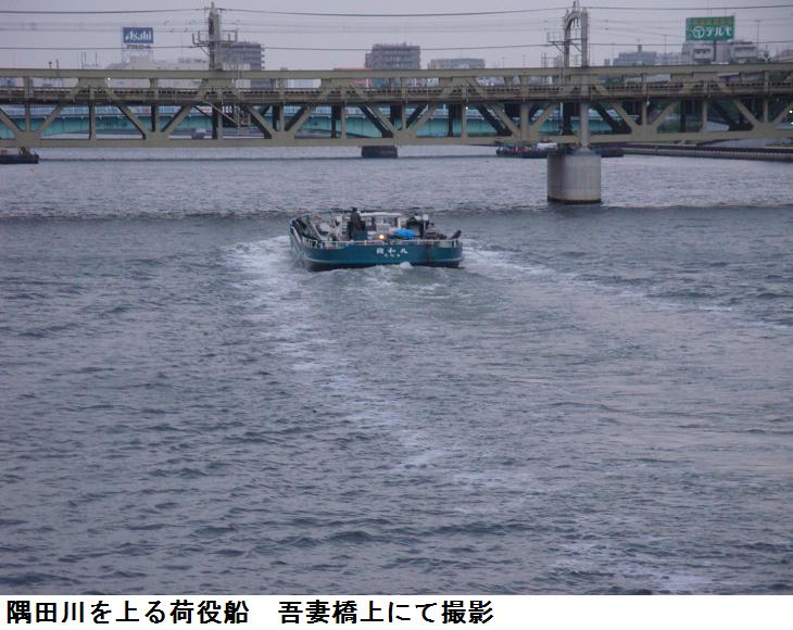 相変わらず必ずといっていいほど、隅田川を上り下りする荷役船に出会うが、墨田区側も台東区側も白鬚橋近くは剃刀堤防が川の景観を阻害する。今日もワンさんと出会い、2・3分話をする。爺のブログも良く見てくれているらしく、情報交換が出来る。