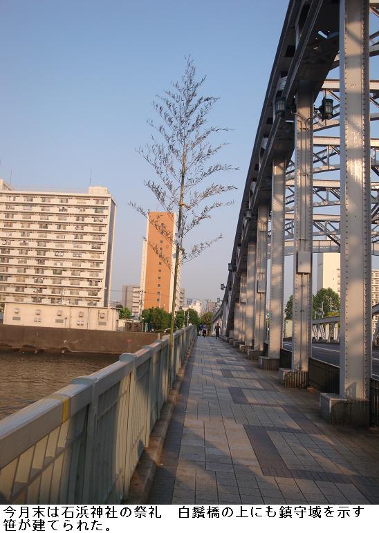 白鬚橋を含む明治通り、橋場一帯の人々は石浜神社の氏子である。今月29日から31日は祭礼であるが、橋の上にも鎮守の区域を示す笹竹が立てられている。
