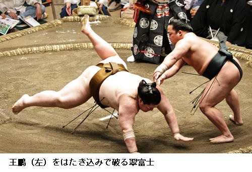 ▽翠富士に王鵬は翠富士がはたき込みで勝ちました。