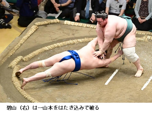 ▽一山本に碧山は碧山がはたき込みで勝ちました。初日から5連勝の2人の対戦は碧山が勝ちました。
