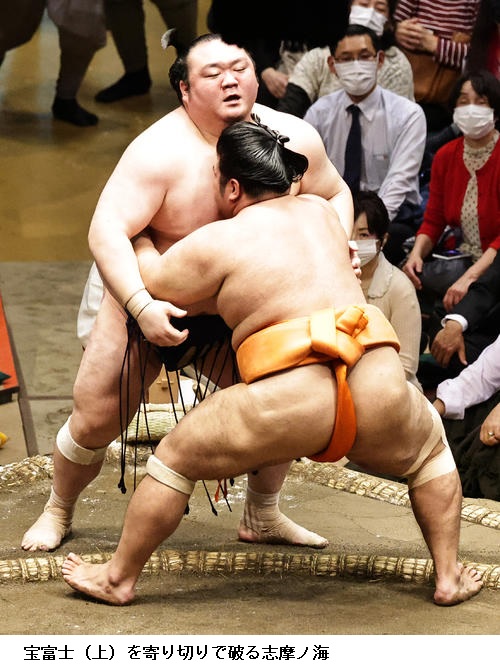 ▽志摩ノ海に宝富士は志摩ノ海が寄り切り。