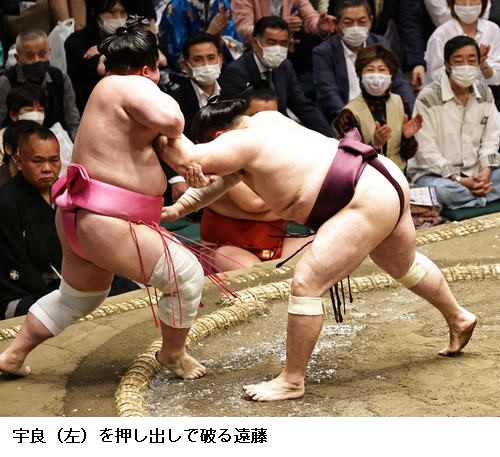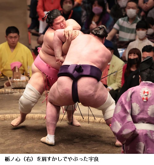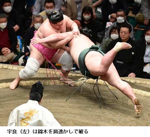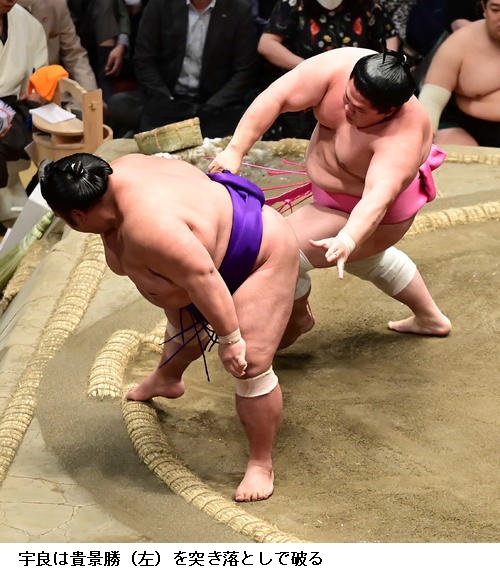 前に出る相撲で4勝目の宇良は13日に元横綱・白鵬の間垣親方から助言をもらったとして「親方からは前に前に攻めた方がいいと言われた。圧力をかけられてきょうは勝てたのでよかった」と話していました。