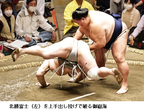 ▽北勝富士に大関・御嶽海は御嶽海が上手出し投げ。