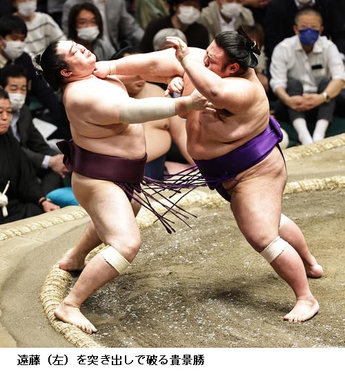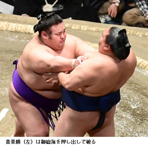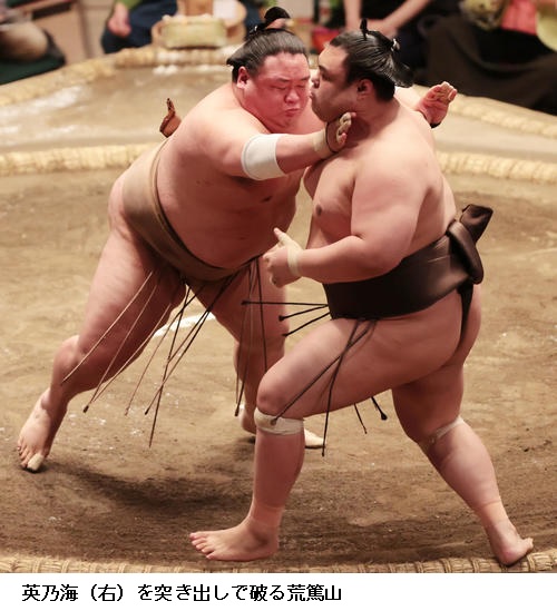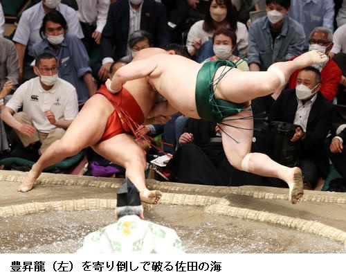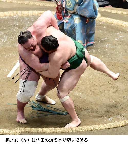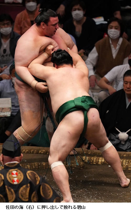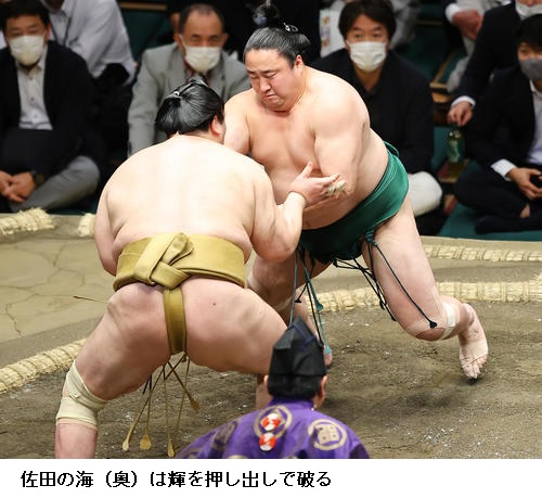 佐田の海はここまで勝ちっぱなしの碧山に勝ってトップに並ぶ6勝目をあげ、「頭を上げないようにと思い我慢して相撲がとれた。しっかり親指に力を入れて相撲を取れと、入門してから言われていることができている」と上機嫌でした。