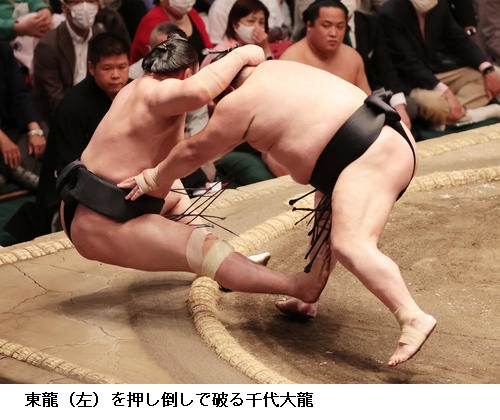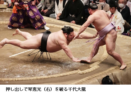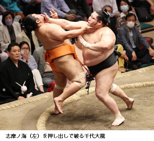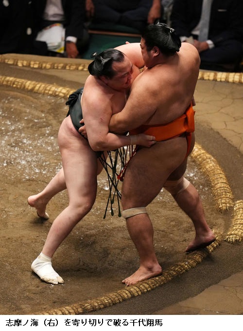 ▽千代大龍に志摩ノ海は千代大龍が押し出しで勝ち越しました。