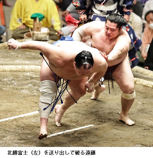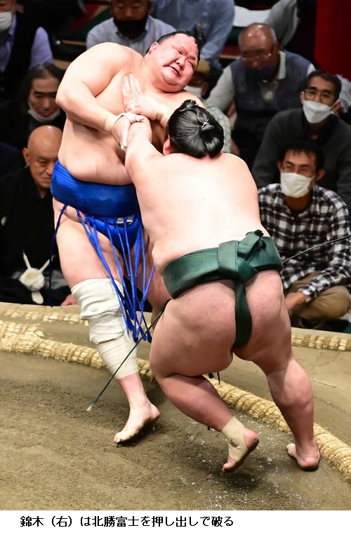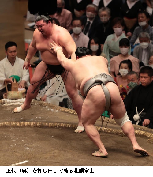 北勝富士は大関・正代を出足で圧倒して2勝目をあげ、「自分らしい相撲を取りたかった。はたかれても前に前にと思っていたのでそれができてよかった。相手が誰であろうとも思いきりやろうという気持ちを忘れず頑張りたい」と15日以降へ、気持ちを高めていました。