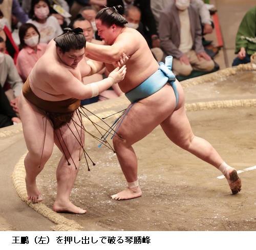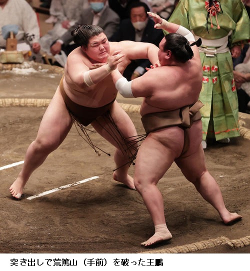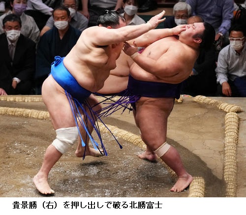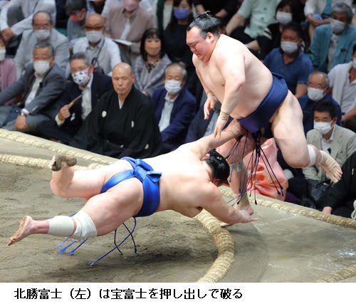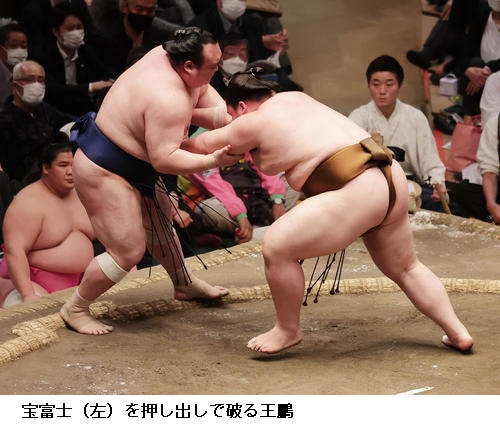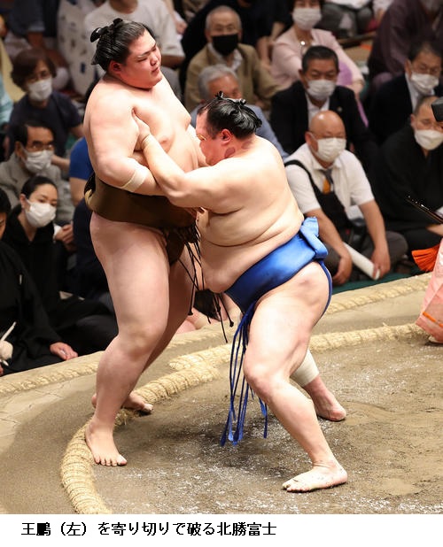 ▽北勝富士に王鵬は北勝富士が寄り切り。
