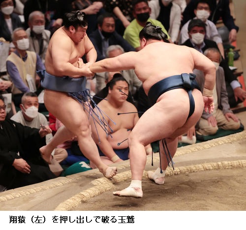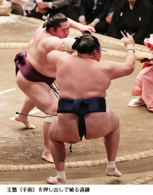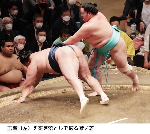 ▽玉鷲に横綱 照ノ富士は玉鷲が押し出しで勝ちました。玉鷲はことしの初場所から3場所続けて金星を挙げました。