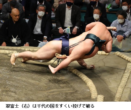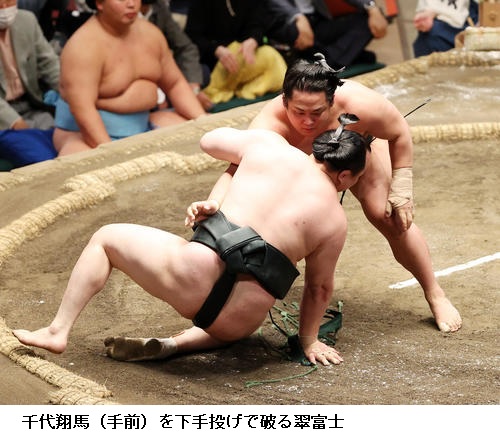 ▽千代翔馬に翠富士は翠富士が下手投げで勝ち越し。千代翔馬は負け越しです。