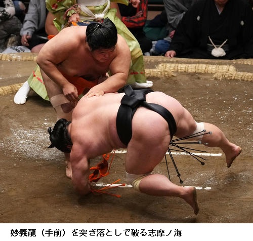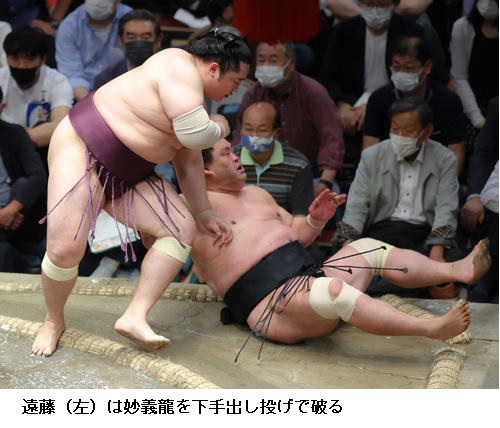 遠藤に妙義龍は遠藤が下手出し投げ。