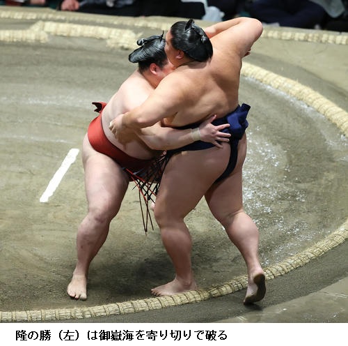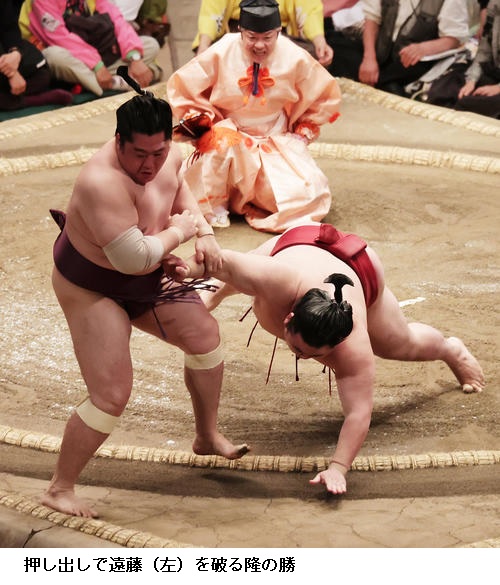 ☆隆の勝 押し込まれましたけど、落ち着いて前に入れたので良かったと思います。相手が小さかったけど、耐えられた。(自分の攻めの体勢から仕留めるのが早いことについて)止まったら、みんな重い人ばかり。止まらないように前に前にという意識です。(白星先行の要因は)勝ちが先行しているので、何連敗もした先場所より落ち着いている。ダメだったことを反省して、稽古をやってきた。(明日の横綱戦は)思いっきり当たるしかない