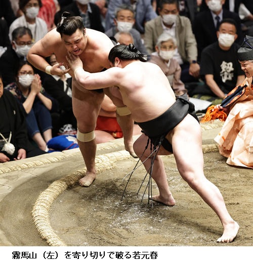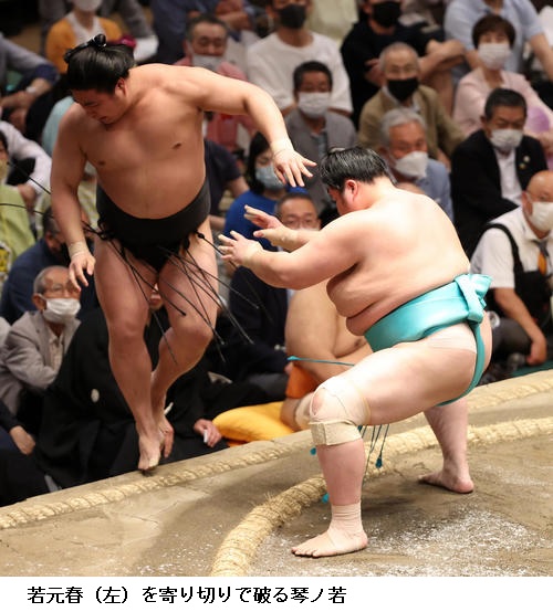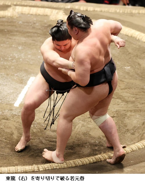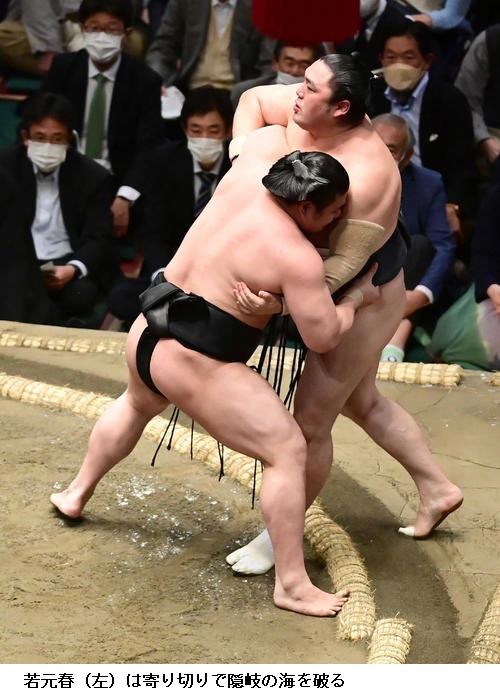 ★若元春 自分の型になったんで、あそこは出るしかなかった。勝てないのは自分が弱いだけ。立ち合いもしっかりいけたし、上手もしっかり浅いところを取れてた。あそこで残されちゃうのは相手が柔らかいのと腰が重いのと、自分が出る力が足りないだけ。(明日で中日折り返しについては)変わらず、一番、一番集中して前に攻めて良い相撲を取るだけです。