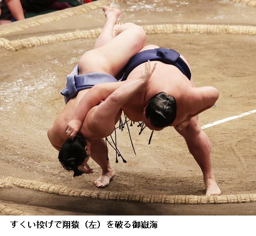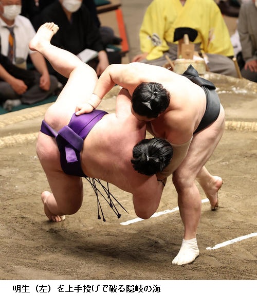 ▽隠岐の海に明生は隠岐の海が上手投げ。