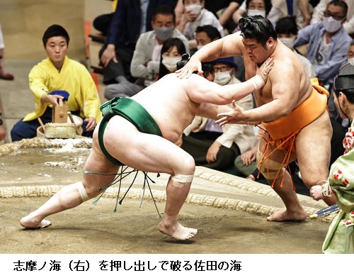 佐田の海は、5勝目を挙げて先場所の勝ち星に並び、「我慢して相撲が取れている。体の調子のよさが白星につながっている」と充実した様子でした。