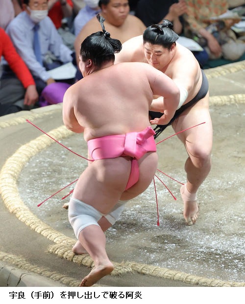 ★宇良 (対戦相手の遠藤について)自分の力がどれぐらい通用するのかなという所で、全く通用しなかった。(中盤戦に向けて)まだ折り返していないのが嫌ですね。もう10日目くらいの気分です。力を出していけるように頑張ります。