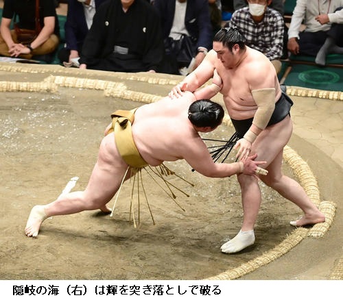 ▽輝に隠岐の海は隠岐の海が突き落としで勝ち越しました。