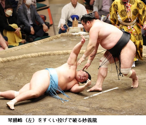 ▽妙義龍に琴勝峰は妙義龍がすくい投げ。琴勝峰は負け越しました。