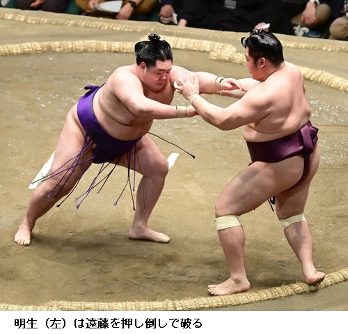 ▽明生に遠藤は明生が押し倒しで勝ち越し。遠藤は負け越しです。