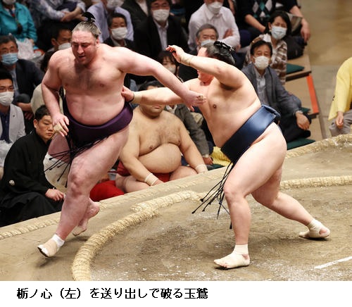 ▽玉鷲に栃ノ心は玉鷲が送り出しで勝ち越しました。