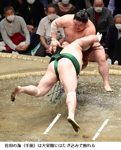 ▽大栄翔に佐田の海は大栄翔がはたき込みで勝って4敗を守りました。佐田の海は4敗に後退しました。