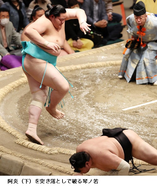 ▽阿炎に琴ノ若は琴ノ若が突き落としで勝ち越しました。