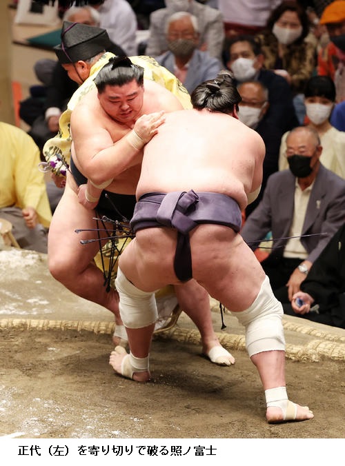 ▽大関 正代に横綱 照ノ富士は照ノ富士が寄り切りで勝って3敗を守りました。