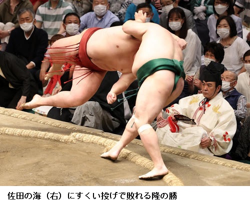 ▽佐田の海に隆の勝は佐田の海がすくい投げで勝って、佐田の海、隆の勝はともに11勝4敗です。佐田の海は敢闘賞、隆の勝は殊勲賞を受賞しました。