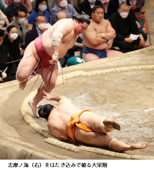 ▽志摩ノ海に大栄翔は大栄翔がはたき込みで勝って11勝4敗としました。大栄翔は殊勲賞受賞です。志摩ノ海は負け越しました。